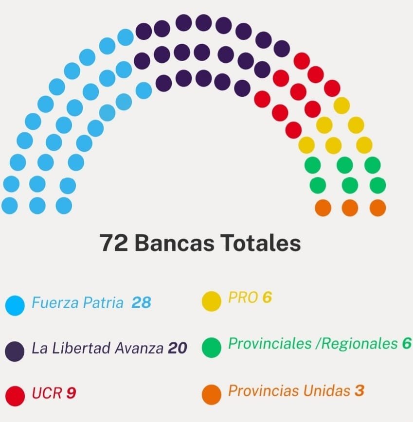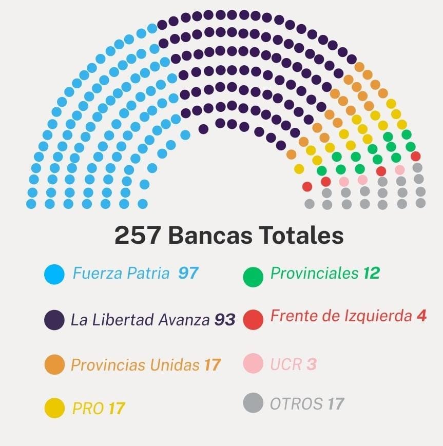 De esta manera, la gestión libertaria sumó escaños tanto en Senado como en Diputados, aunque sin tener el control en ambos recintos. En la Cámara Alta, sumará ahora 13 escaños, que se le suman a los 6 senadores que ya tenía. En tanto, en la Cámara Baja acumulará 64 bancas a su representación a partir del 10 de diciembre y podría alcanzar junto a aliados el tercio necesario para sostener los vetos presidenciales.