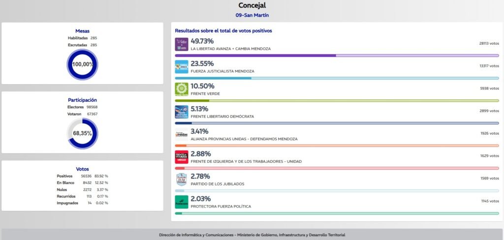 Las votaciones se realizaron con normalidad, siendo que a las 21 horas se dieron a conocer los resultados oficiales, donde los candidatos de Rufeil llevaban la ventaja electoral. Pasade la madrugada de hoy lunes, y con el 100% de las mesas escrutadas podemos decir que la LLA -CM amplió sus datos estadísticos a un 49,73%, en segundo lugar, quedo el PJ con un 23,55% y en tercer lugar el Partido Verde con un 10.50%.