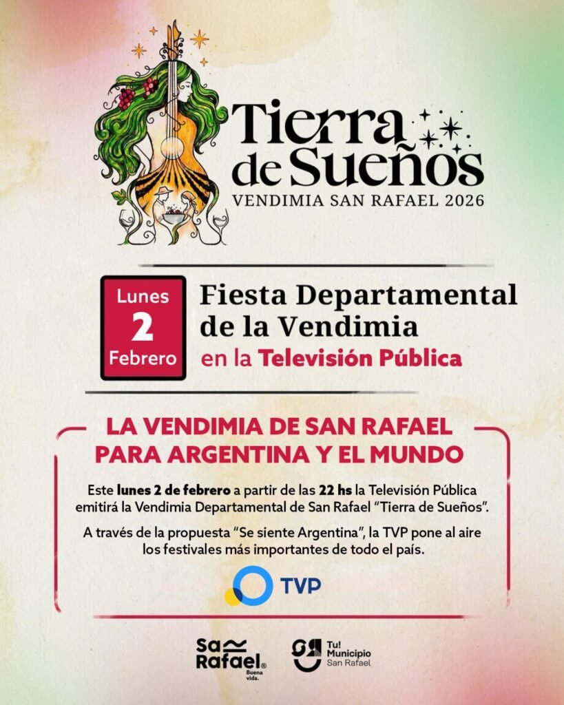 Este lunes 2 de febrero, a partir de las 22 horas, la Televisión Pública emitirá la Vendimia Departamental de San Rafael, llevando la celebración sanrafaelina a todo el país y al exterior.
