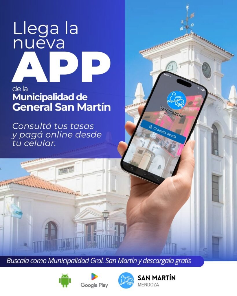 La app (municipalidad Gral. San Martín) ya se encuentra disponible para su descarga gratuita en las plataformas Google Play y Android, y está pensada para facilitar el cumplimiento de las obligaciones municipales desde el celular y en cualquier momento del día.